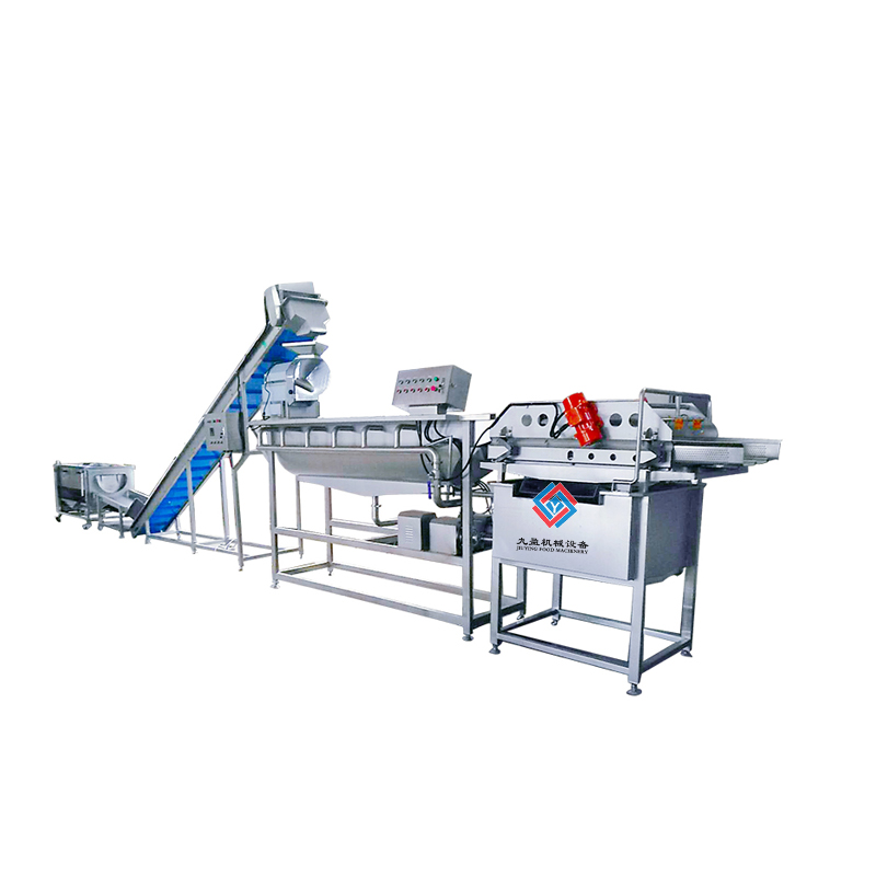 蔬菜清洗加工生產(chǎn)線前道工序可以將原料輸送至切菜機,之后通過切菜機進行物料的加工,通過進入皮帶提升機,再通過提升機將物料輸送至水流清洗機進行清洗,水流會通過輸送帶將產(chǎn)品傳送至振動瀝水機進行去渣工作,之后再進入二次水流清洗機用流水進行清洗,0-5度的冷水能夠保證蔬菜的質(zhì)量、口感、成色以及儲存周期的特點,之后通過二次振動瀝水機進行濾水除渣,就能夠完成蔬菜前期的處理工作。